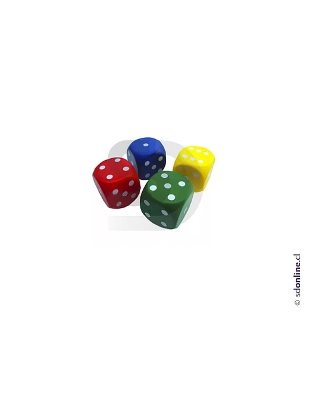 Set de 4 dados de punto color, diseñado en goma eva, cuyo tamaño es de 4,2 cms. El objetivo principal es introducir al niño en el desarrollo del pensamiento lógico-matemático y conocimiento de cantidades, ejercicios como suma, resta, división y multiplicación, del mismo modo conceptos de mayor o menor, etc.