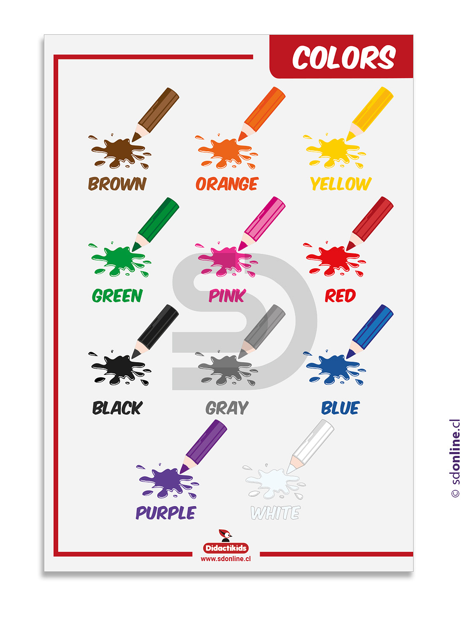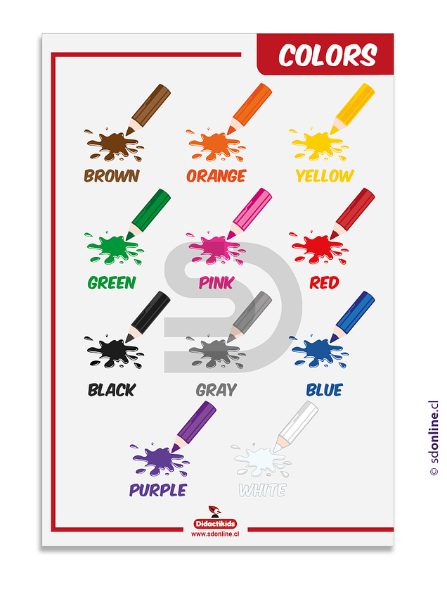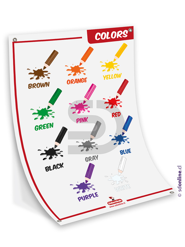 El objetivo del cartel de motivación y conocimiento de los colores es introducir a los niños en los nombres de los colores básicos educar visualmente sobre conceptos o características de los colores de una manera clara y atractiva, utilizando imágenes y mensajes combinados para captar la atención y reforzar el aprendizaje en un entorno específico, como un aula o un espacio de trabajo en idioma inglés.Viene en dos presentaciones: