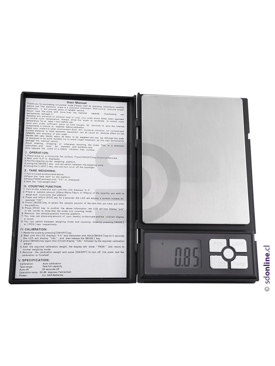 digital de presicion tipo note books.Incluye funda estuche de proteccion.Tamaño 18x8 cms.Superficie de peso 12x7 cms apróx.Incluye 2 baterias AAA.Tamaño apróx 20x10 cms.