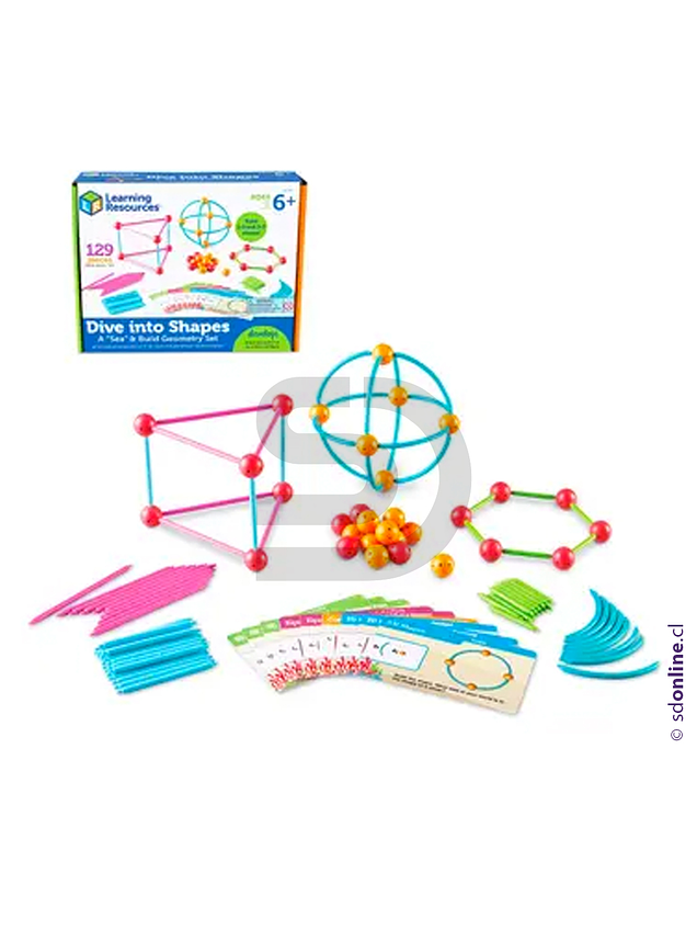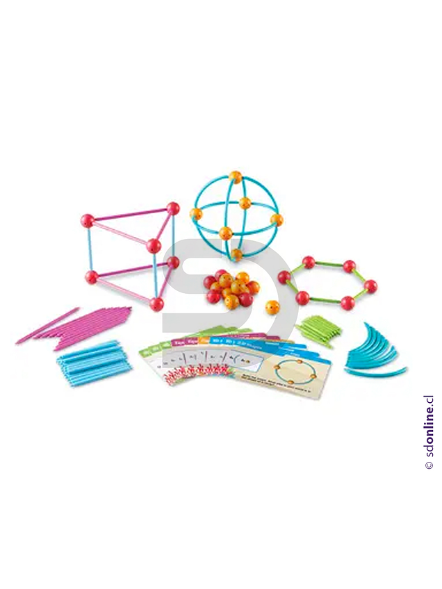 Set compuesto por 129 piezas, distribuidas en 60 palos plásticos de 3 tamaños (6cm, 9 cm y 13 cm), 20 curvas plásticas, 34 conectores plásticos de aproximadamente 2 cm de diámetro, 15 tarjetas de doble cara y 1 guía de actividades. Material diseñado para construir formas 2D y 3D. Desarrolla habilidades de geometría.