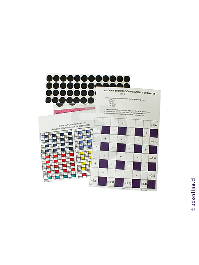 Objetivo: Desarrollar y coordinar los pensamientos, interactuando en grupo y estimulando a los participantes a la búsqueda de nuevas formas de razonar, facilitando la concentración y mejorando las habilidades lingüísticas. Contiene 10 crucigramas de adición y sustracción, multiplicación y división de números naturales, con tabla de resultados impresos con cartulina termolaminada con unas medidas aproximadas de 20x12cm. Se puede aplicar desde 3° año de educación general básica.