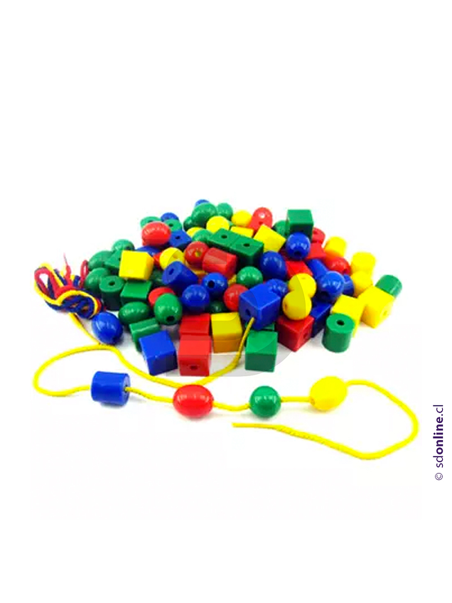 Set de 160 cuentas, material plástico resistente, en 4 modelos y colores, tales como: Rojo, amarillo, azul y verde, con diferentes auguras geométricas. Este material permite reforzar actividades tales como: seriación, clasificación, secuencias y desarrollo de la motricidad fina. Contiene 4 cordones para enlazar. Cada pieza mide 2,1 cm aproximadamente.