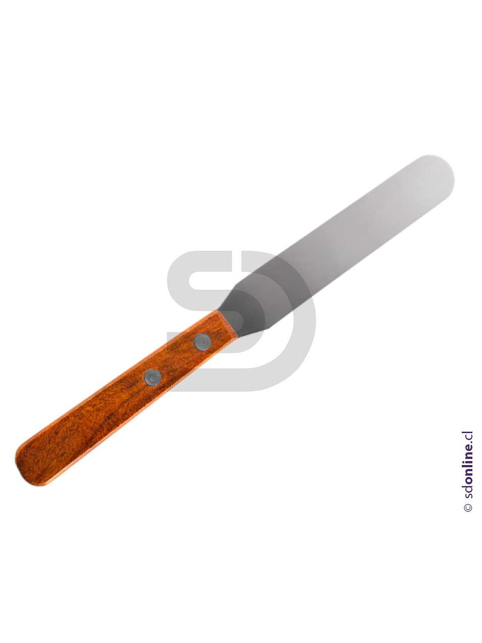Elemento compuesto por una lámina plana angosta de acero inóxidable que se encuentra adherida a un mango hecho de madera, plástico o metal. Es utilizada principalmente para trasegar sólidos y tomar nuestras de sólidos. Largo de hoja 15 cms.Ancho apróx 2,3 cms. Largo total apróx 25 cms.