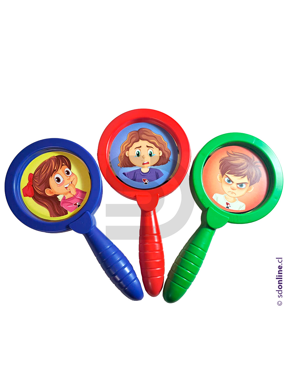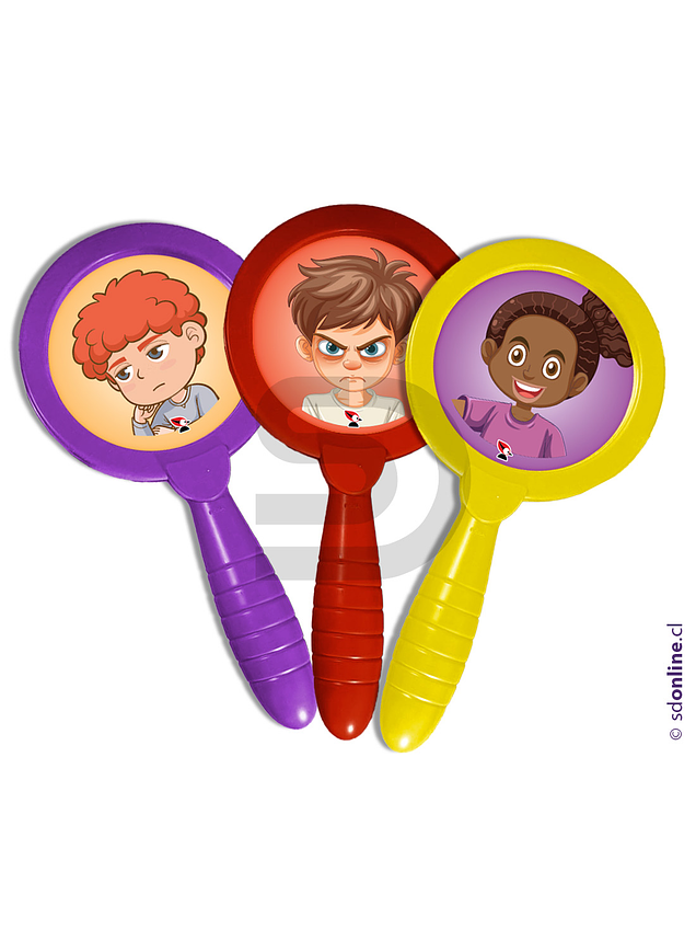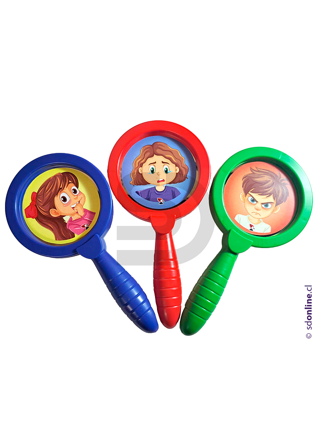 Los niños podrán identifican e interpretar estados de ánimo y emociones, a través de estas diferentes imágenes. Cada elemento cuenta con un espejo irrompible por un lado y una imagen animada en el otro, reconociendo e identificando cada emoción en sí mismos. El set contiene 6 espejos de plástico de colores diferentes.