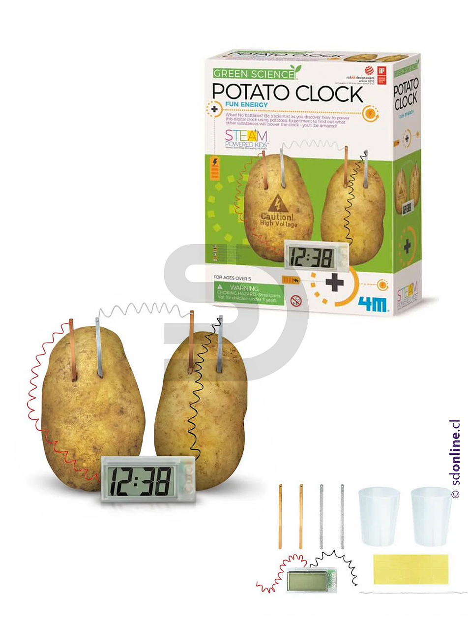 ¡Qué! ¿Sin baterias?Sé un científico y descubre el poder del reloj digital usando papas. Experimenta y descubre que otros elementos pueden dar energía al reloj. Dimensiones: Alto 22cm x Ancho 6cm x Largo 17cm.