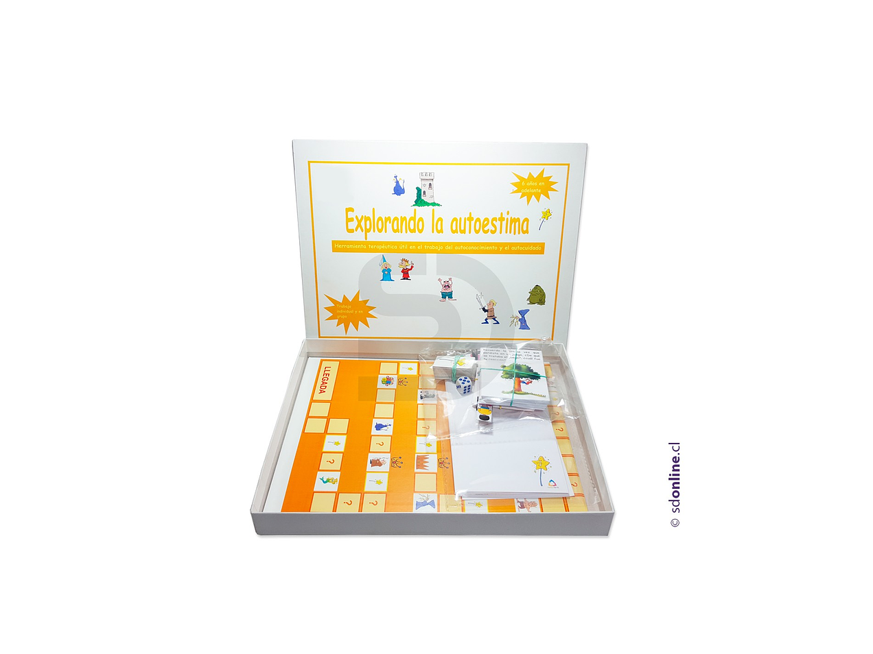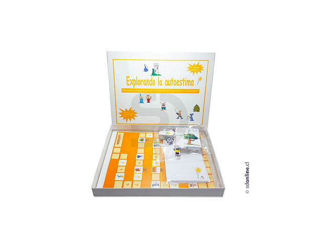 Objetivo:Explorando el autoestima es una herramienta terapeutica enfocada a trabajar aquellos aspectos que amenazan y favorecen el autoconcepto, iniciando un viaje por un camino lleno de obstaculos y refuerzos por el cual el objetivo final sera encontrarse a si mismo. Contiene 1 tablero, 4 fichas personificadas, 1 dado, set de tarjetas con los derechos de las personas con autoestima adecuada, set de tarjetas con personajes que atacan el autoestima, 12 varitas magicas, set con notas de peticion de deseos, tarjetas con preguntas e intrucciones de uso. Dirigido a partir de los 6 años. Medidas aproximadas de la caja 29,5x23x3cm.