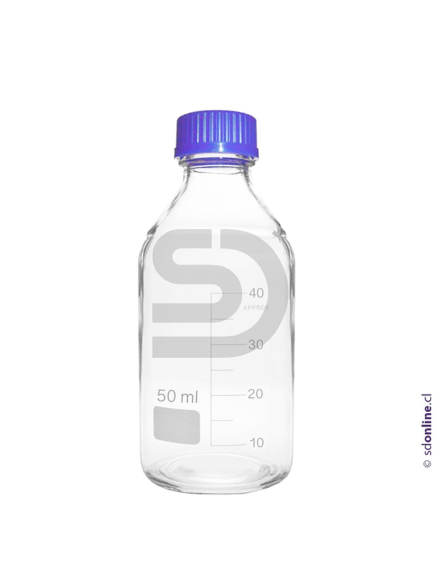 Frasco graduado borosilicato tapa azul hermética 50ml