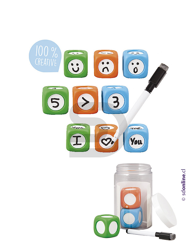 Incluye 3 dados mas plumón con borrador.