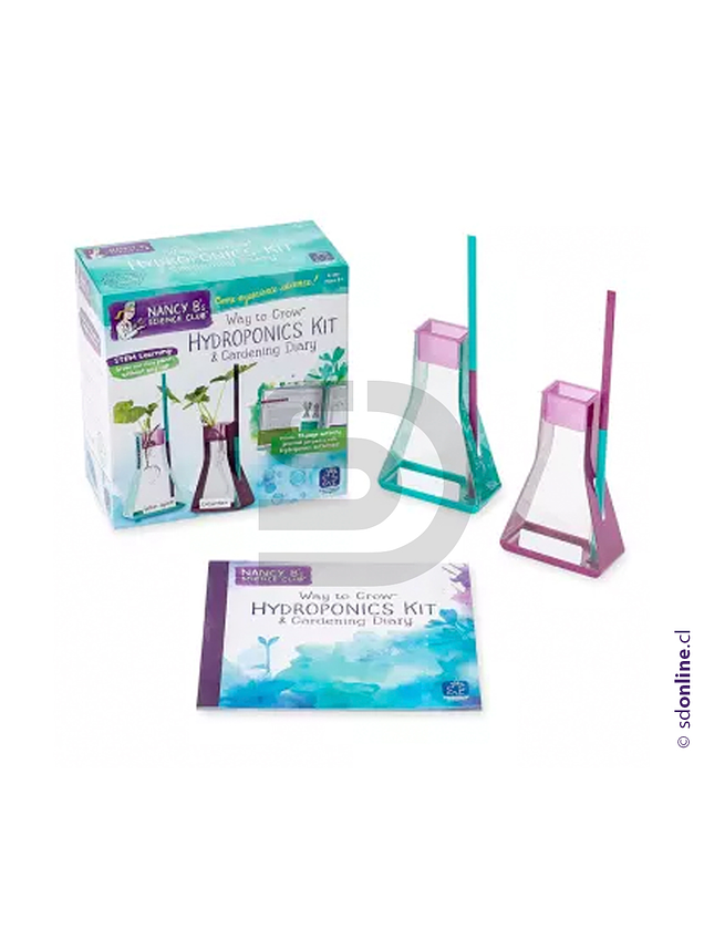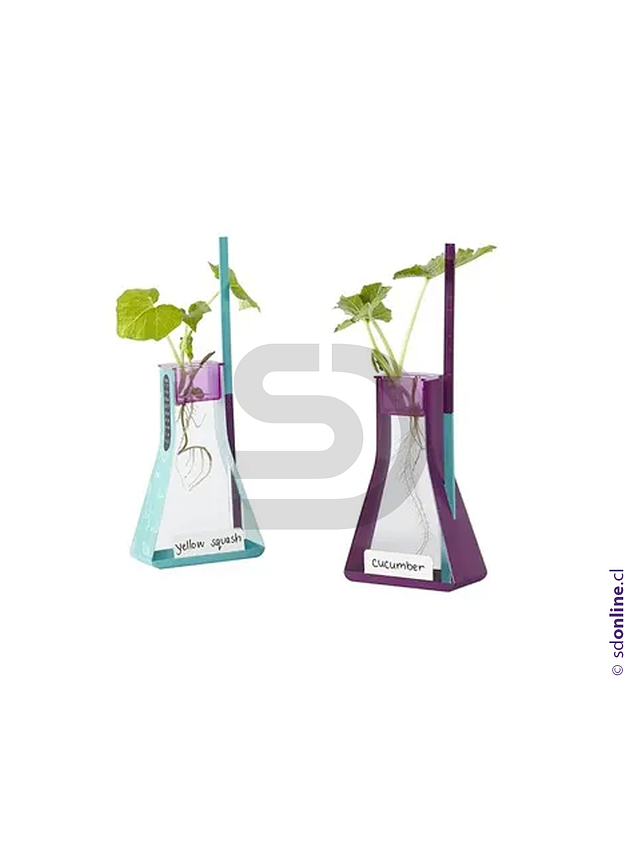 Kit hidropónico compuesto por 2 cestas de semillas, 2 frascos con termómetros, 2 reglas y 1 diario de actividades de 22 páginas. Desarrolla el aprendizaje del cultivo, observación y medición. Estimula el interés por la biología y botánica.