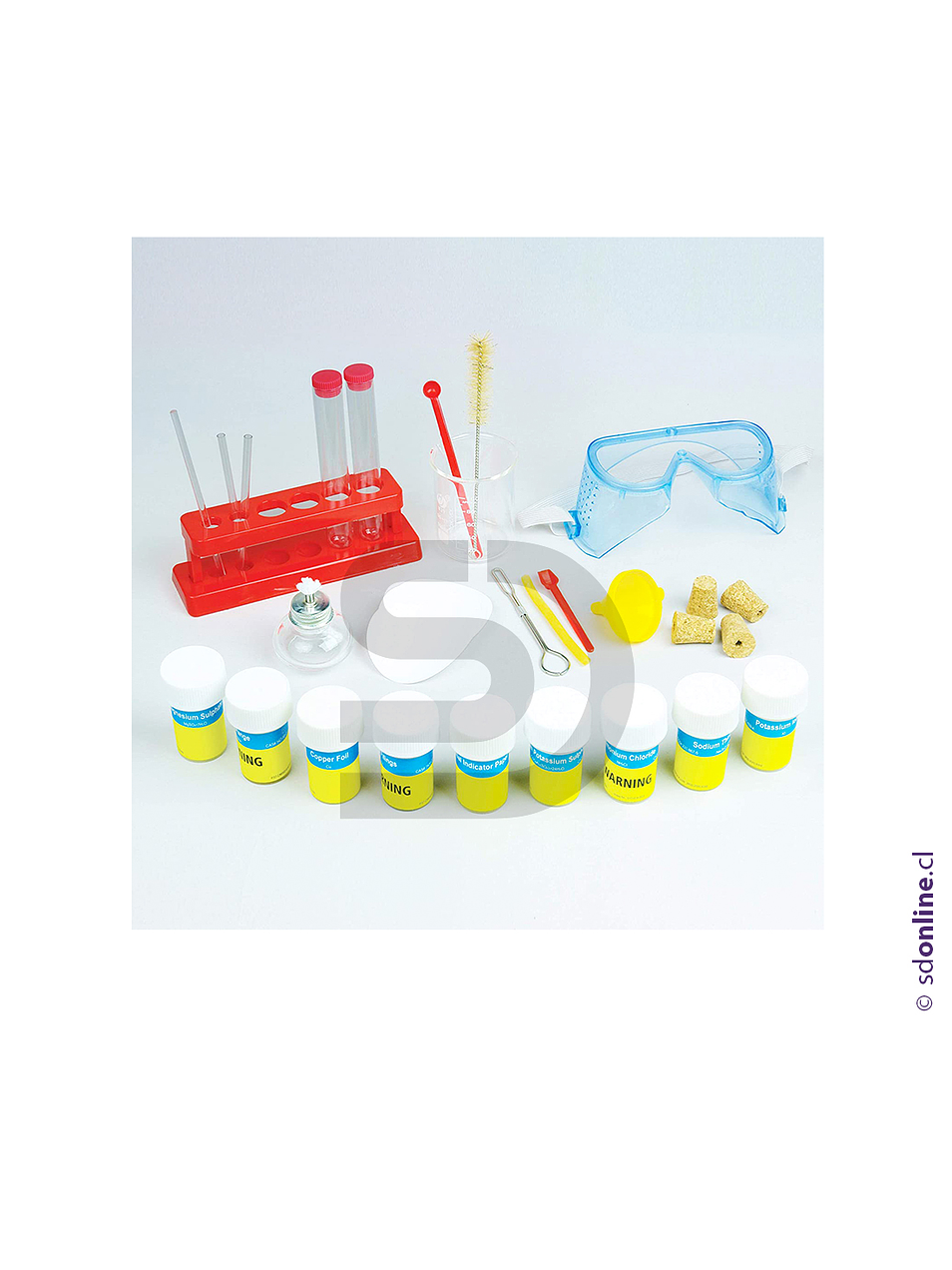 Incluye 100 experimentos de aprendizaje , (20) Productos químicos, (8) Tornasol Papers, (4) Tubos de ensayo con tapones, Tubos de ensayo en rack, Porta tubos de ensayo, (2) Tapón-Corchos, (3) Tapón-corchos con agujeros, (3) Tubos de cristal,Tubos de goma, Boquilla, Cepillo, Embudo, (6) Filtros de papel, Lámpara Alcohol, (2) Cucharas dosificadoras, Varilla agitadora, 100 ml Vaso, 100 ml Cristal Frasco cónico, Gafas de seguridad.