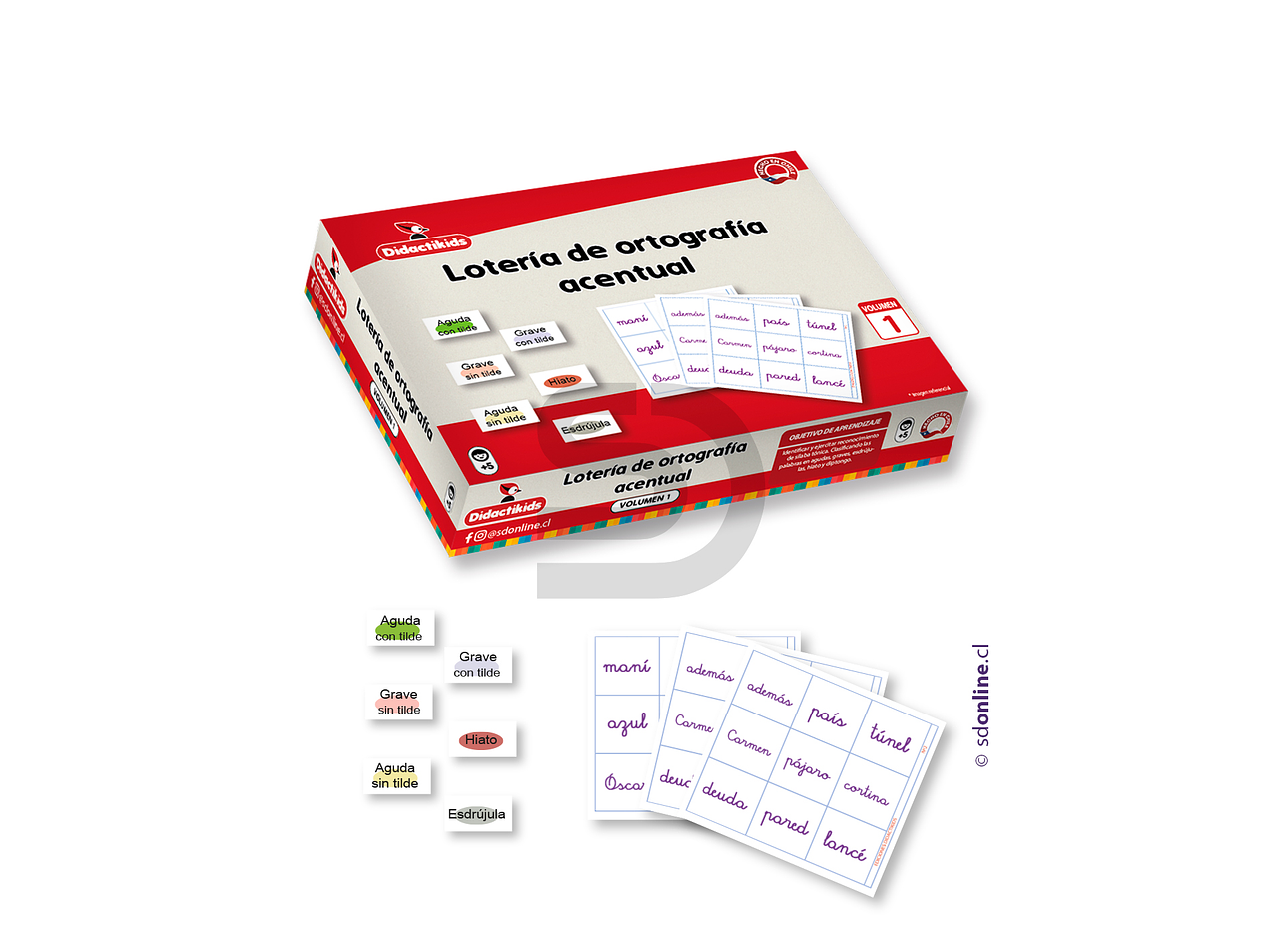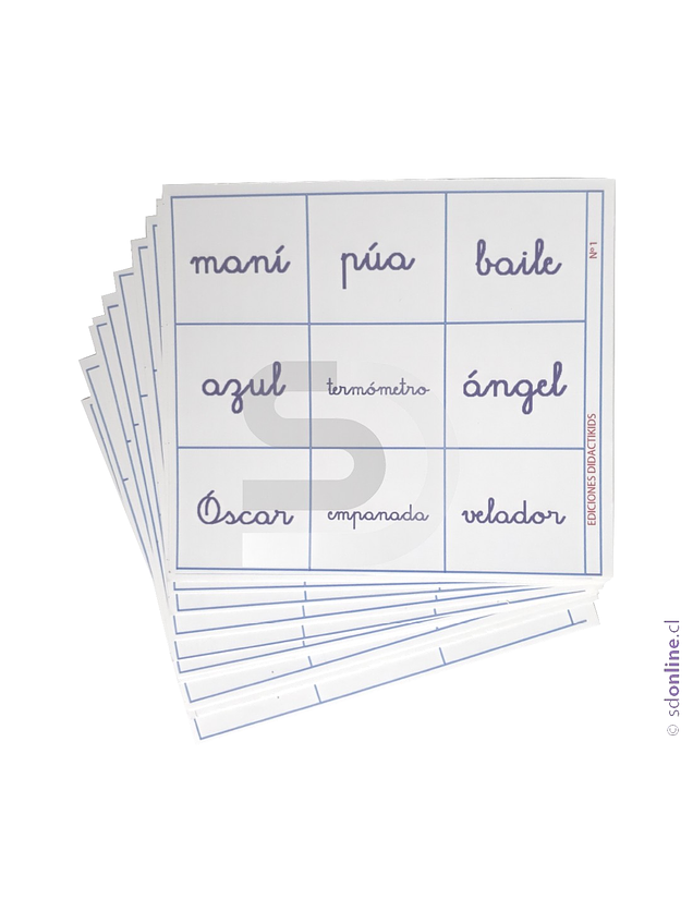 Objetivo: Identificar y ejercitar reconocimiento de sílaba tónica. Clasificando las palabras en agudas, graves, esdrújulas, hiato y diptongo. Contiene: 12 cartones de lotería con unas medidas aproximadas de 13x10cm, 129 fichas de clasificación y 30 palabras para clasificar.
