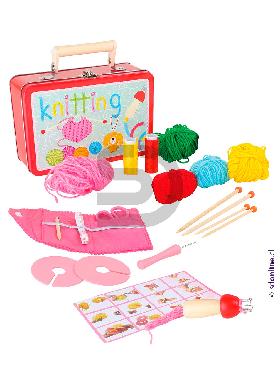 Todo el set viene en una pequeña maleta de metal: ¡Perfecta para llevar de un lado a otro! Medidas aproximadas 20x15x7cm, Agujas de tejer aprox. 21x1x1cm, Dirigido a partir d ellos 6 años. Material utilizado madera, metal y tela. Contiene 20 piezas.