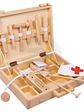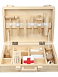 Este maletín de madera tiene todo lo que un buen médico necesita para hacer sus rondas: lápices, teléfono de emergencia y hasta jeringuillas. Maletín de madera de gran calidad con un contenido abundante. Si, además, el maletín se completa en casa con material del botiquín, los pequeños asistentes ya no podrán parar. Medidas: 39x33x9 cm.