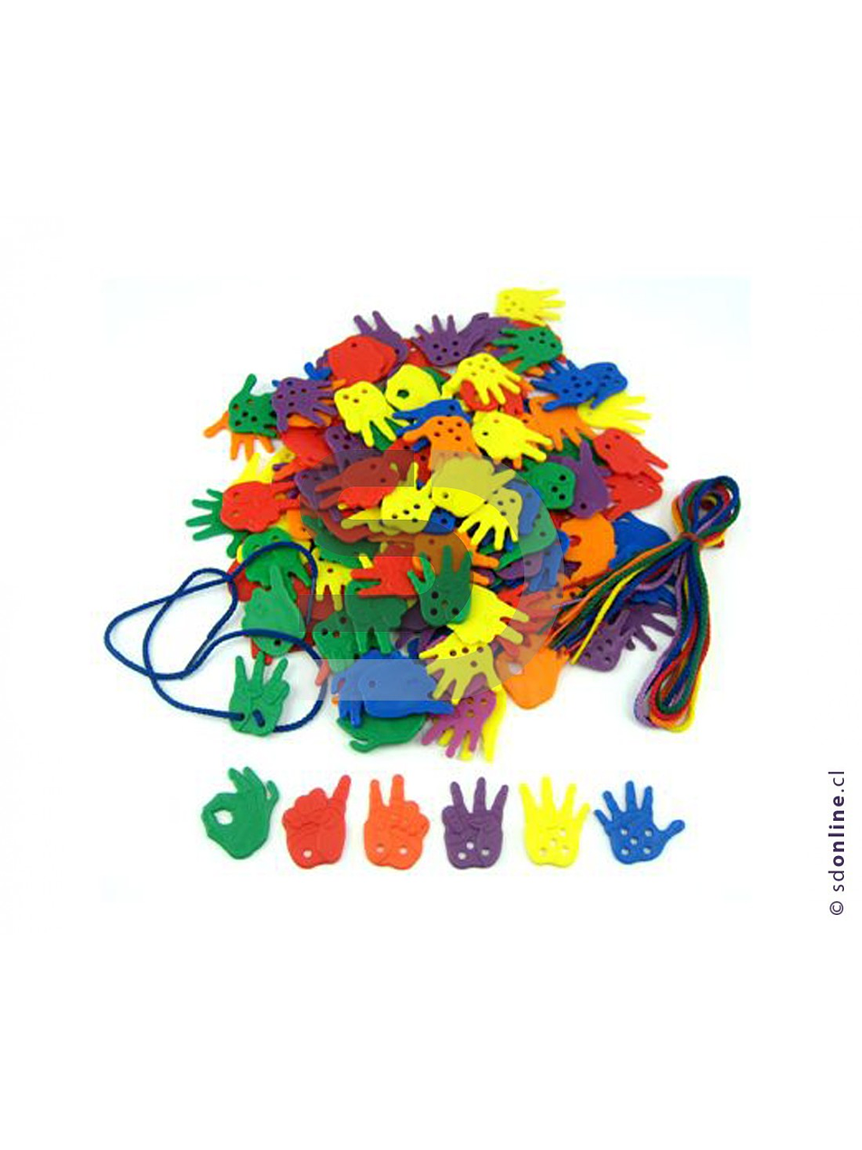 Objetivo: Manitos contadoras. Set de 72 manitos en material plástico de diferente colores. Juego muy completo en el que, además de ensartar y de motivar ejercicios de seriación y clasificación, también ayuda a comprender el concepto de lateralidad ya que incluye manos izquierdas y derechas. Estimula el aprendizaje del número tanto en el concepto de grafía como en el de cantidad. En cada mano el número se representa mediante la grafía en relieve y mediante los dedos para indicar la cantidad. También los agujeros para ensartar se corresponden con el número. Presentación: Bolsa plástica tipo ziploc.
