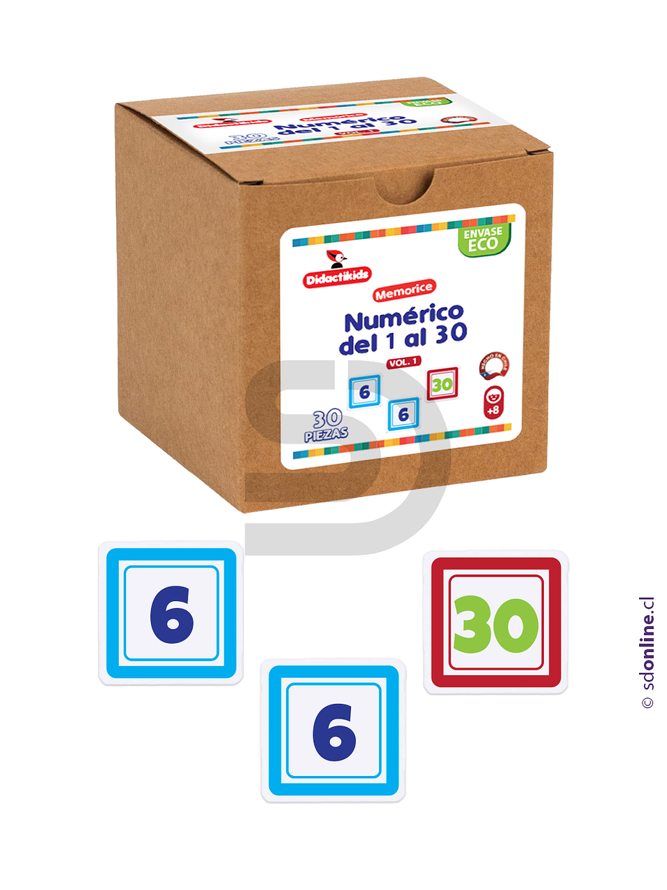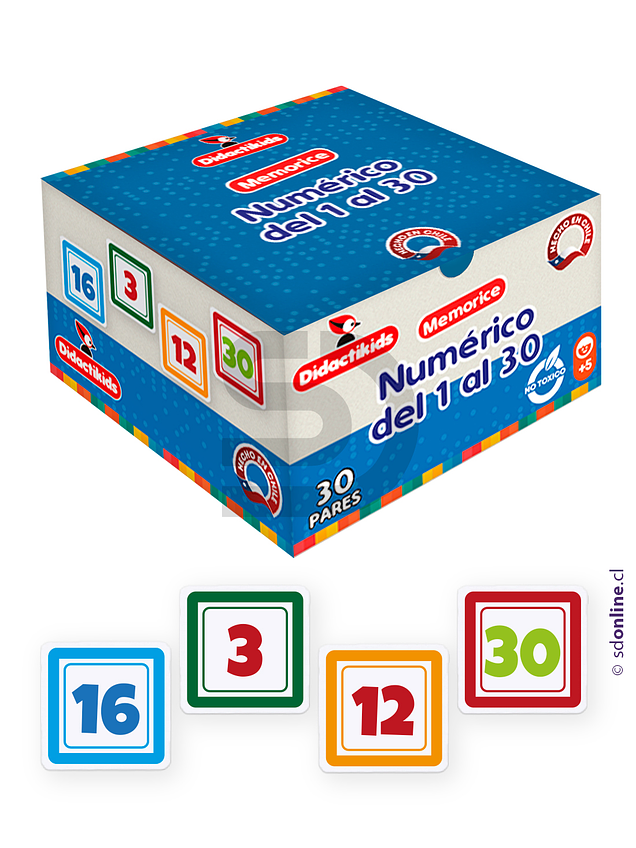 Set de 60 fichas o 30 pares por un lado con los números del 1 al 30, y por otro son blancas, para que los niños puedan jugar al memorice y descubrir los pares.