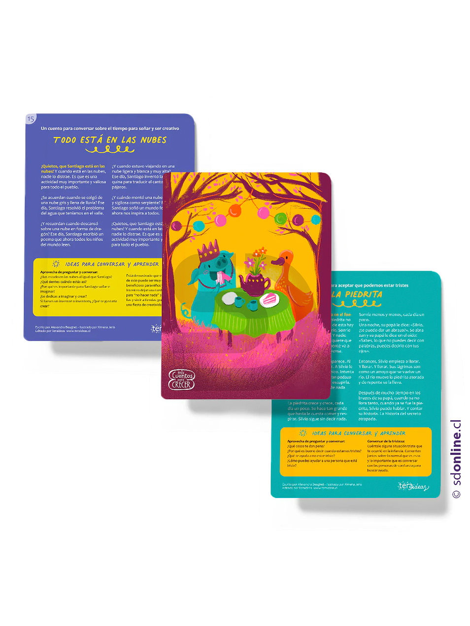 Cada cuento trata sobre una temática distinta como la amistad, la tristeza, la gratitud, hacer deporte, pedir ayuda y muchos más. La idea es conversar con los niños sobre estos temas que nos ayudan a crecer, para eso cada lámina incluye preguntas e ideas para hacer juntos.
