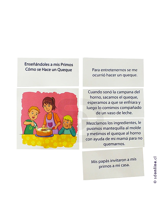 Objetivo: Trabajar las habilidades de descripción de personajes, acciones y situaciones en un relato. Estimular la expresión oral y escrita, reconocimiento y articulación de secuencias temporales. Desarrollar la morfosintaxis en diferentes niveles y la capacidad narrativa. Contiene: 6 imágenes con sus respectivos títulos y 4 tarjetas con oraciones para cada participante que narra la imagen. Total 36 tarjetas con unas medidas aproximadas de 15x10cm.