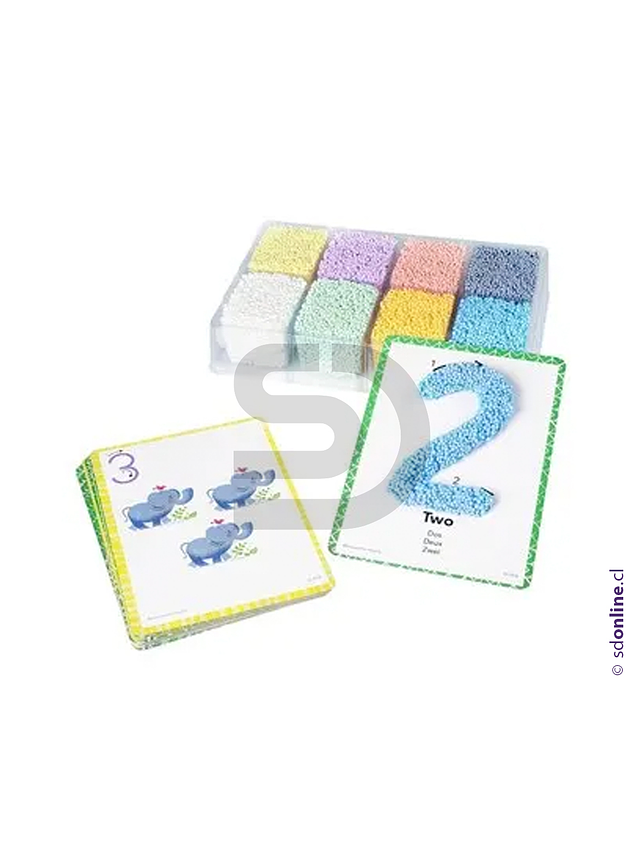 Set incluye 8 ladrillos de playfoam de colores y 13 cartas de doble cara de números, de medidas 13 x 18 cm. Diseñado para que los niños y niñas moldeen las masas encima de las tarjetas. Desarrolla habilidades prácticas de moldeamiento y de formas numéricas.