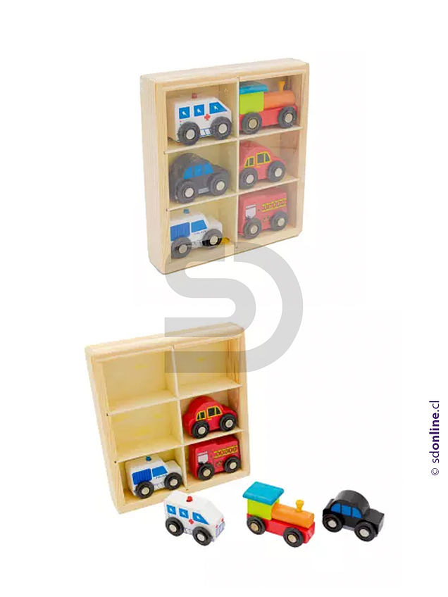 Set de 6 tipos de medio de transporte como taxi, ambulancia, bomberos, policía, auto y tren, material madera, medidas entre 7,5 y 5 cm. Desarrolla motricidad, lenguaje oral y juego de roles. Presentación caja de madera 19 x 17 x 4 cm.