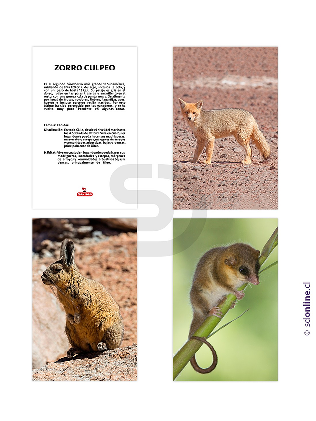 El set incluye 12 láminas con imágenes reales de animales de chile en su hábitat natural, en su parte posterior se indican características generales de cada especie, ayudando a estimular el conocimiento y desarrollando el lenguaje. Elaborado en cartulina termolaminada, Cada lamina tiene una dimensión aproximada de 45x29x0.2 Cms.