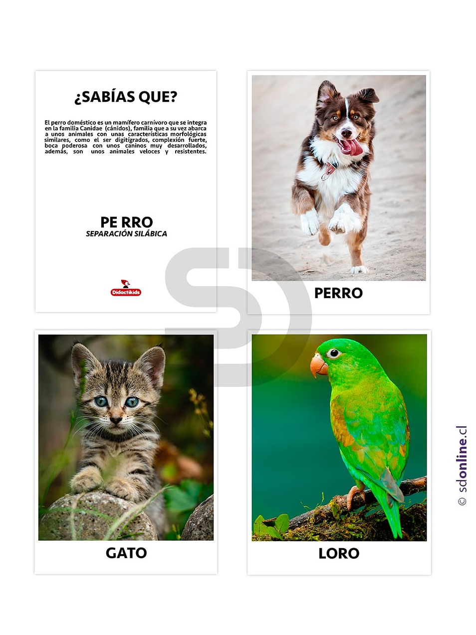 El set incluye 18 láminas con imágenes reales de animales domésticos, en su parte posterior se indican características generales de cada especie, el nombre del animal esta escrito con una separación silábica ayudando a estimular el conocimiento y desarrollando el lenguaje. Elaborado en cartulina termolaminada, Cada lamina tiene una dimensión aproximada de 30x22.5x0.2 Cms.