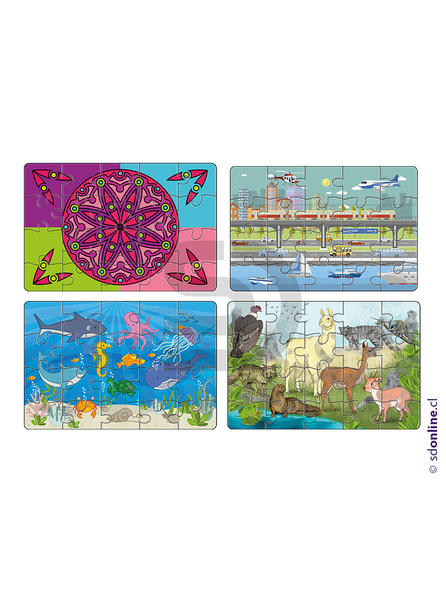 Cada Puzzle contiene 24 piezas realizadas en cartón grueso termolaminado e impresas con medidas aproximadas de 30x20 cms.