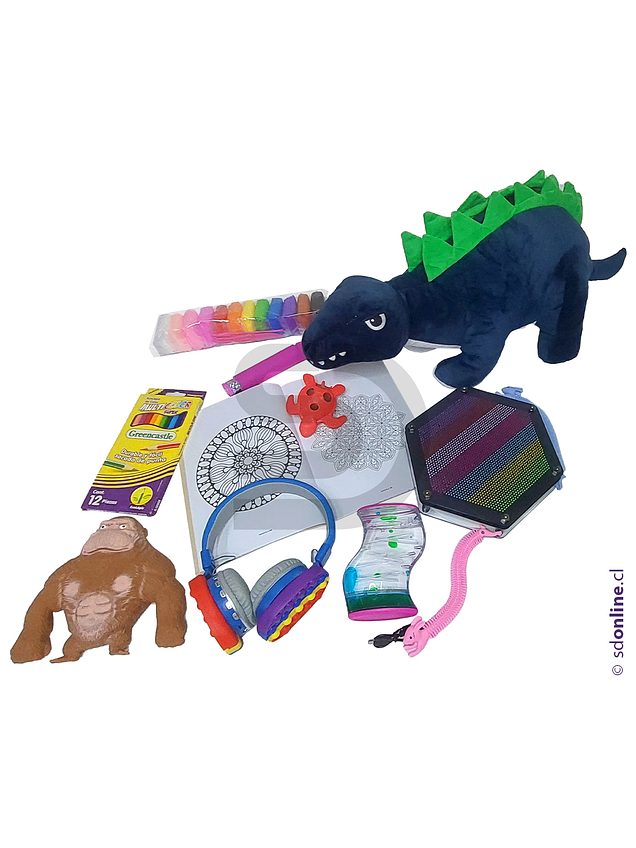 Set de calma anti estrés integrado por:1 dinosaurio tamaño 65x30x20 cms peso 1,3k, resorte, gorila, libro mandalas con lápices de colores, mano con pinchos, set de masas 12 colores, reloj anti estrés de aceite, auricular con popit y kit calma squishi.