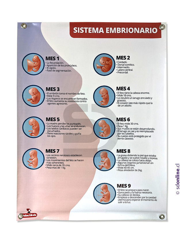 En este afiche podemos observar las diferentes etapas y desarrollo del embrión durante los 9 meses de embarazo.