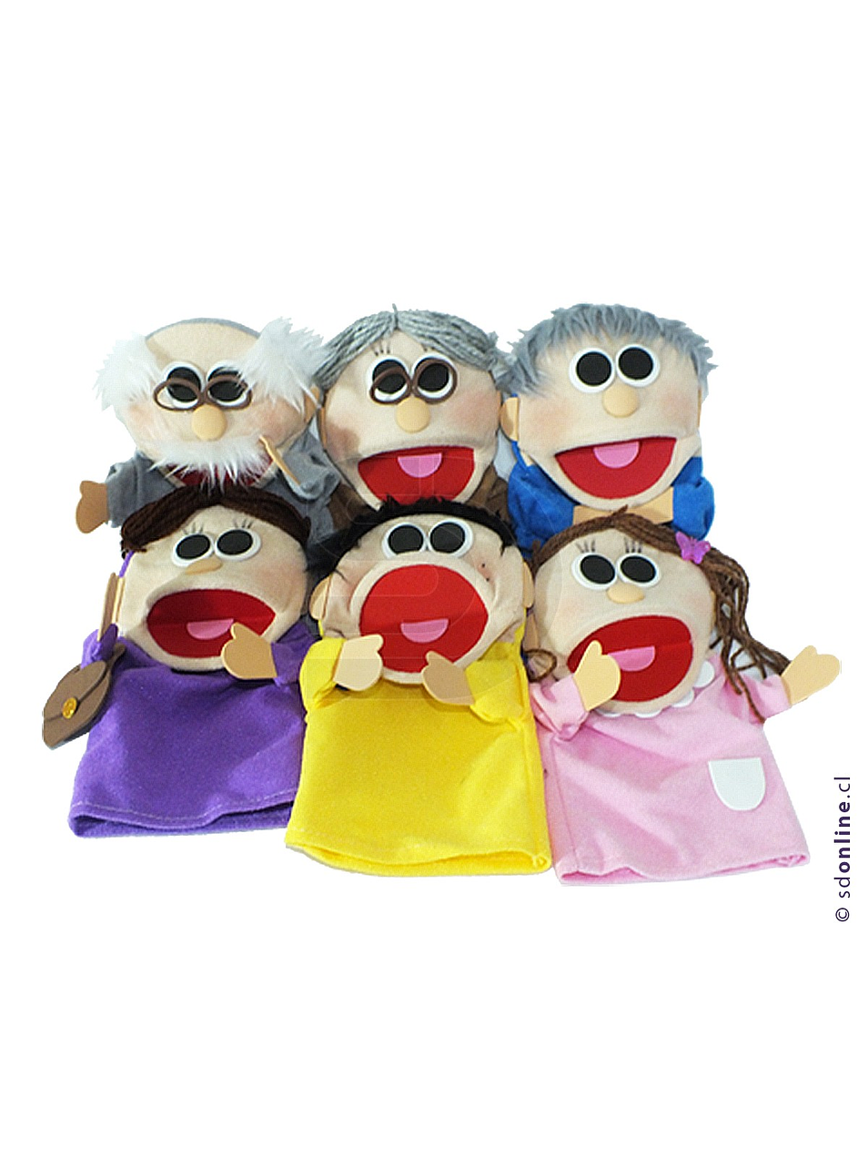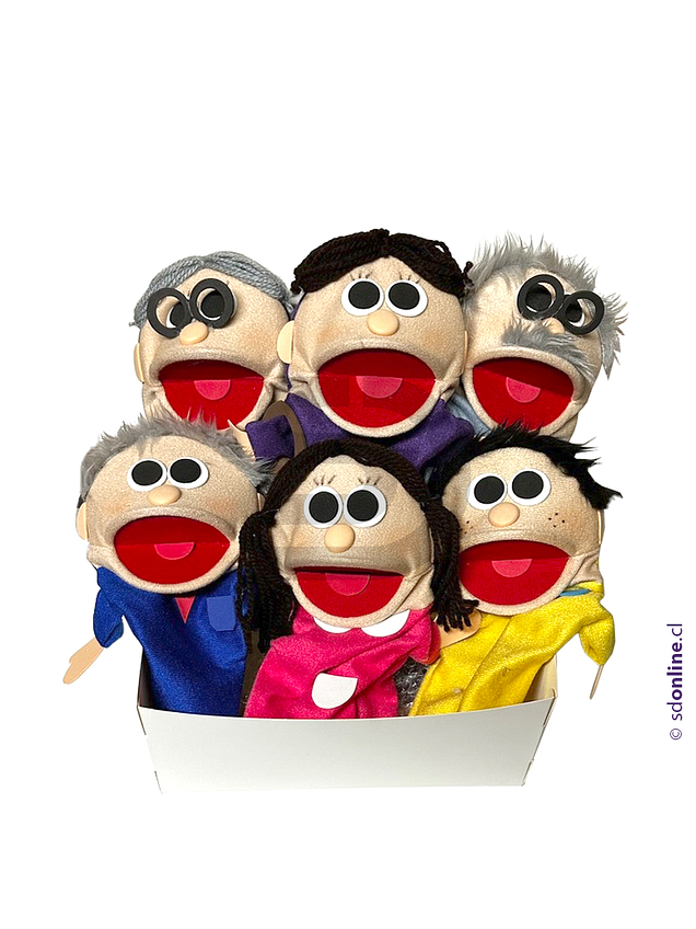 Objetivo: Educar y entretener a los participantes, captando la atención de los más pequeños. A través de ellos se pueden expresar ideas, sentimientos, así como representar hechos de la vida diaria. Contiene un títere de mama, papa, hijo, hija, abuela y abuelo. Cada títere con una medida aproximada de 22cm.
